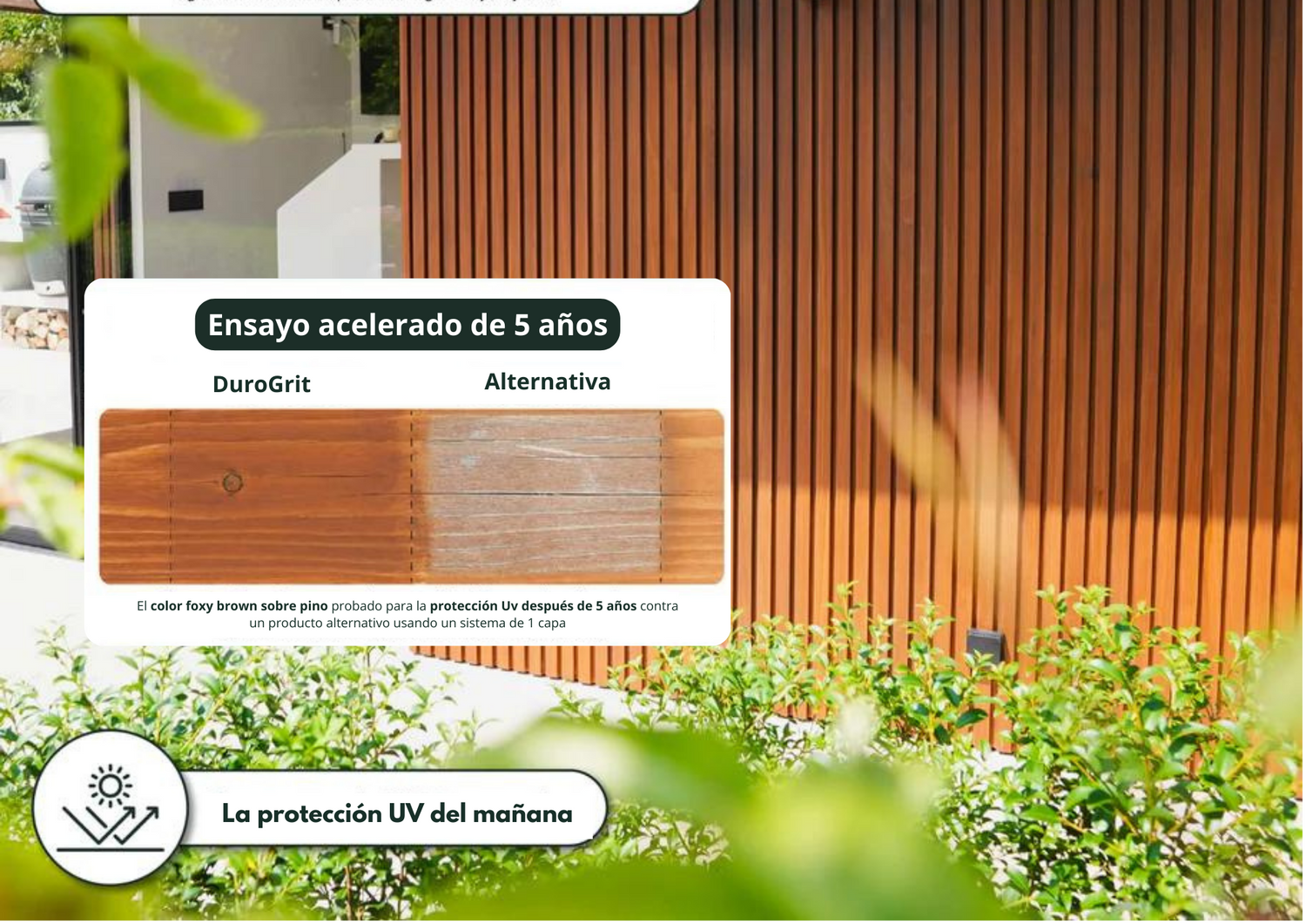 DuroGrit garantiza que su madera repele el agua y la suciedad. Su formulación única con poros abiertos evita el agrietamiento y la descamación, ofreciendo un acabado más duradero con menos mantenimiento y menos preocupaciones.